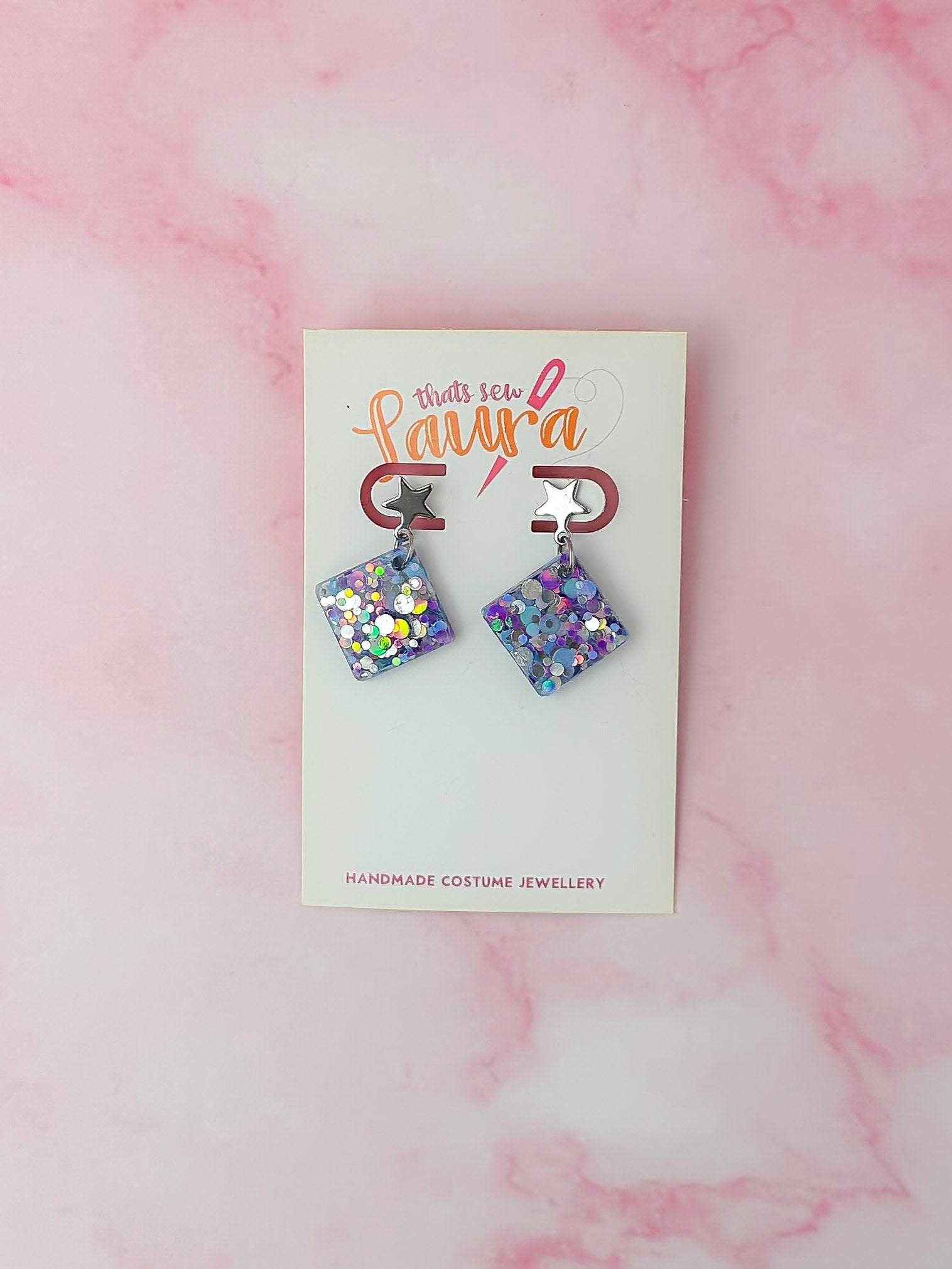 Cancer Diamonds - silver & blue glitter Resin Earrings