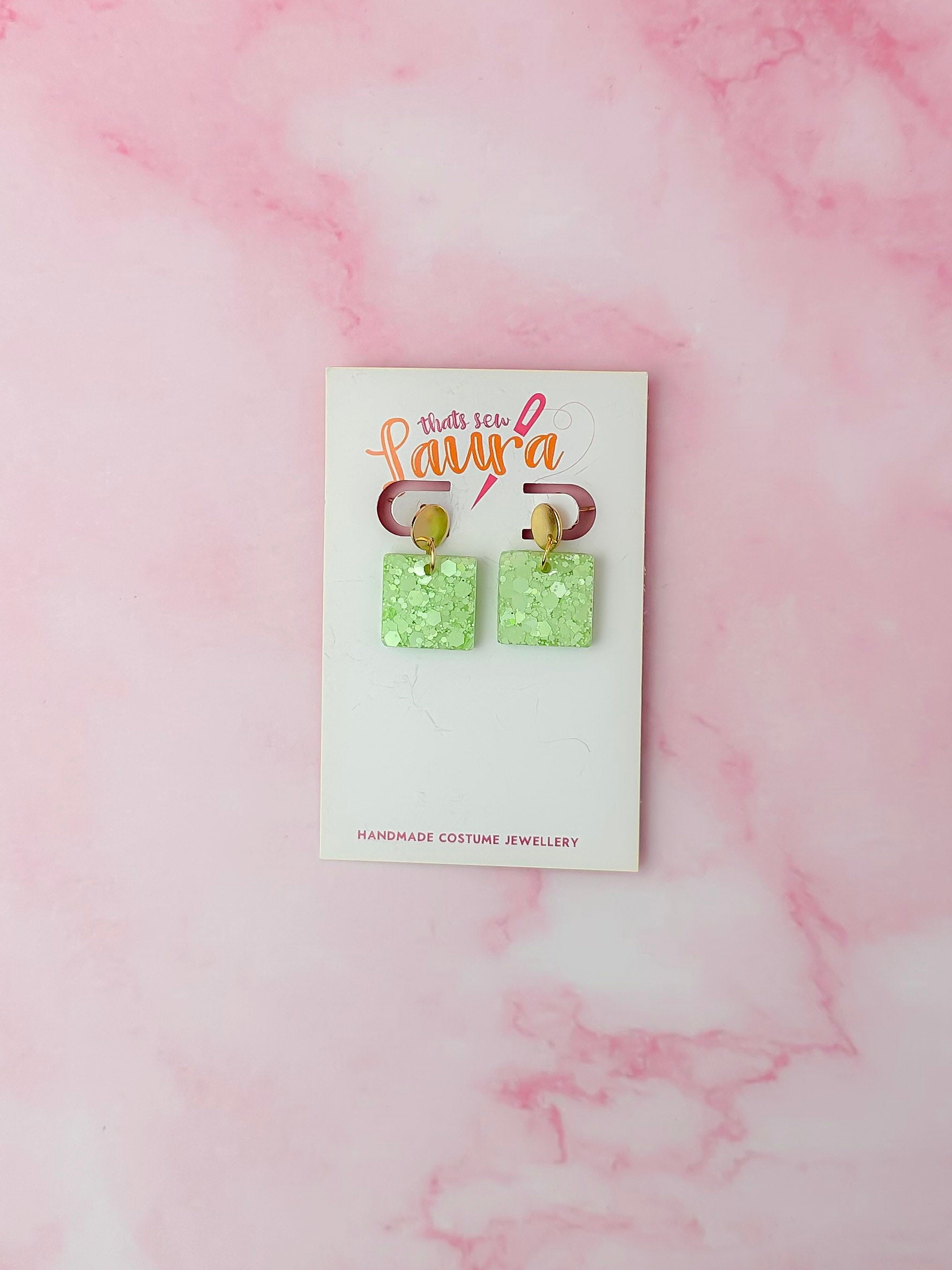 Lime Squares - Pastel lime glitter disc drops Resin Earrings