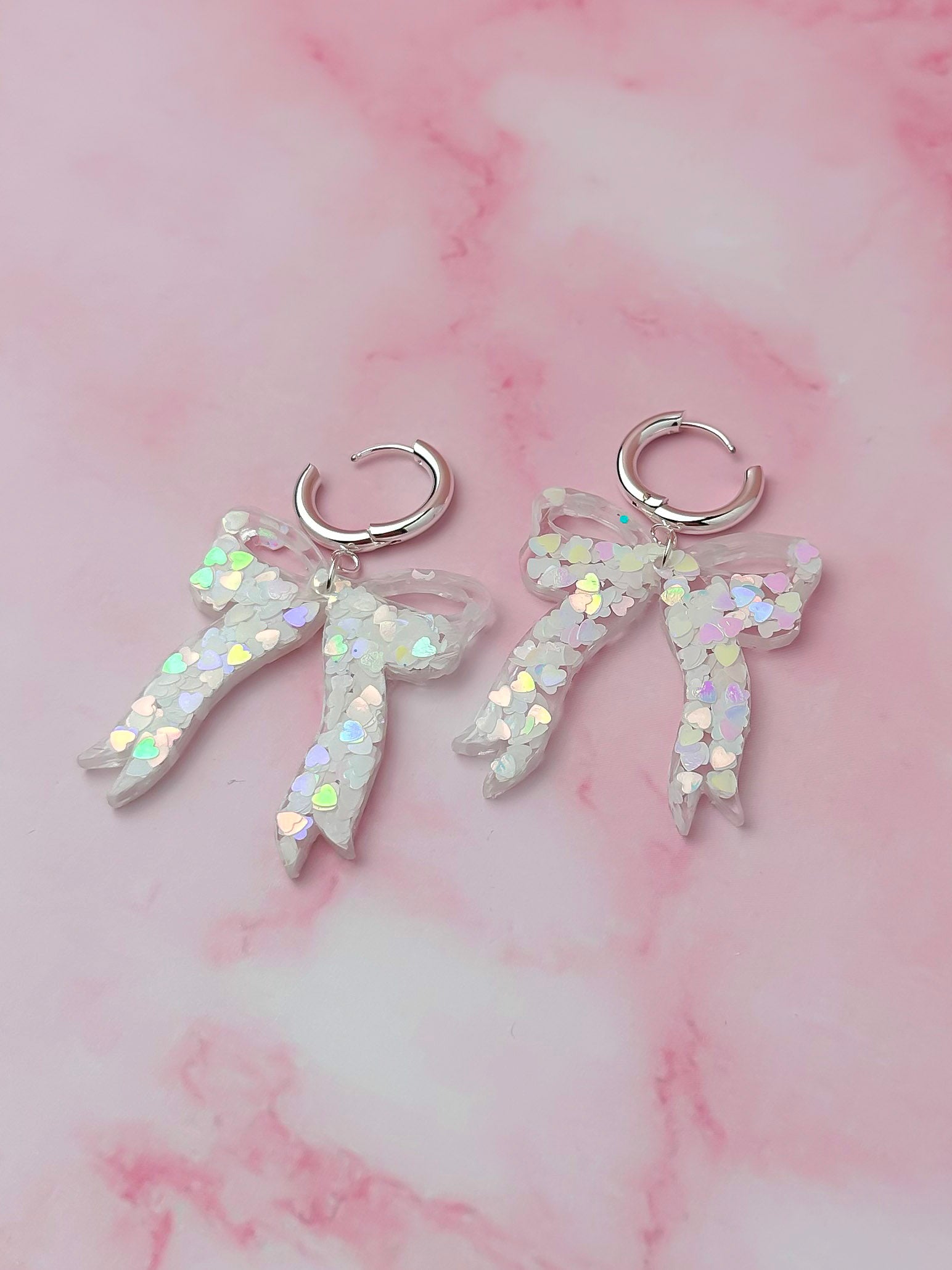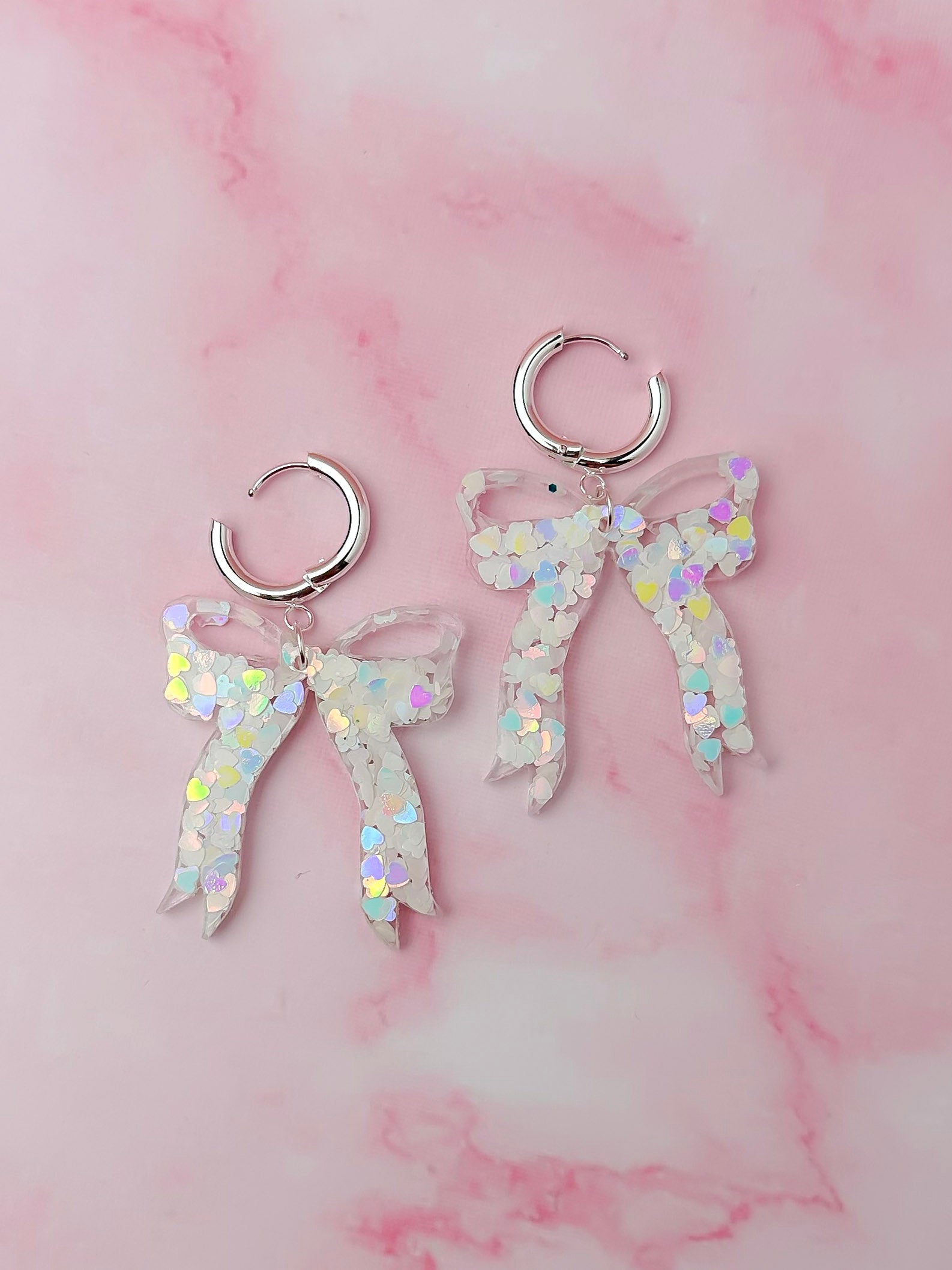 Marry Me Bows - White iridescent heart glitter Resin Earrings