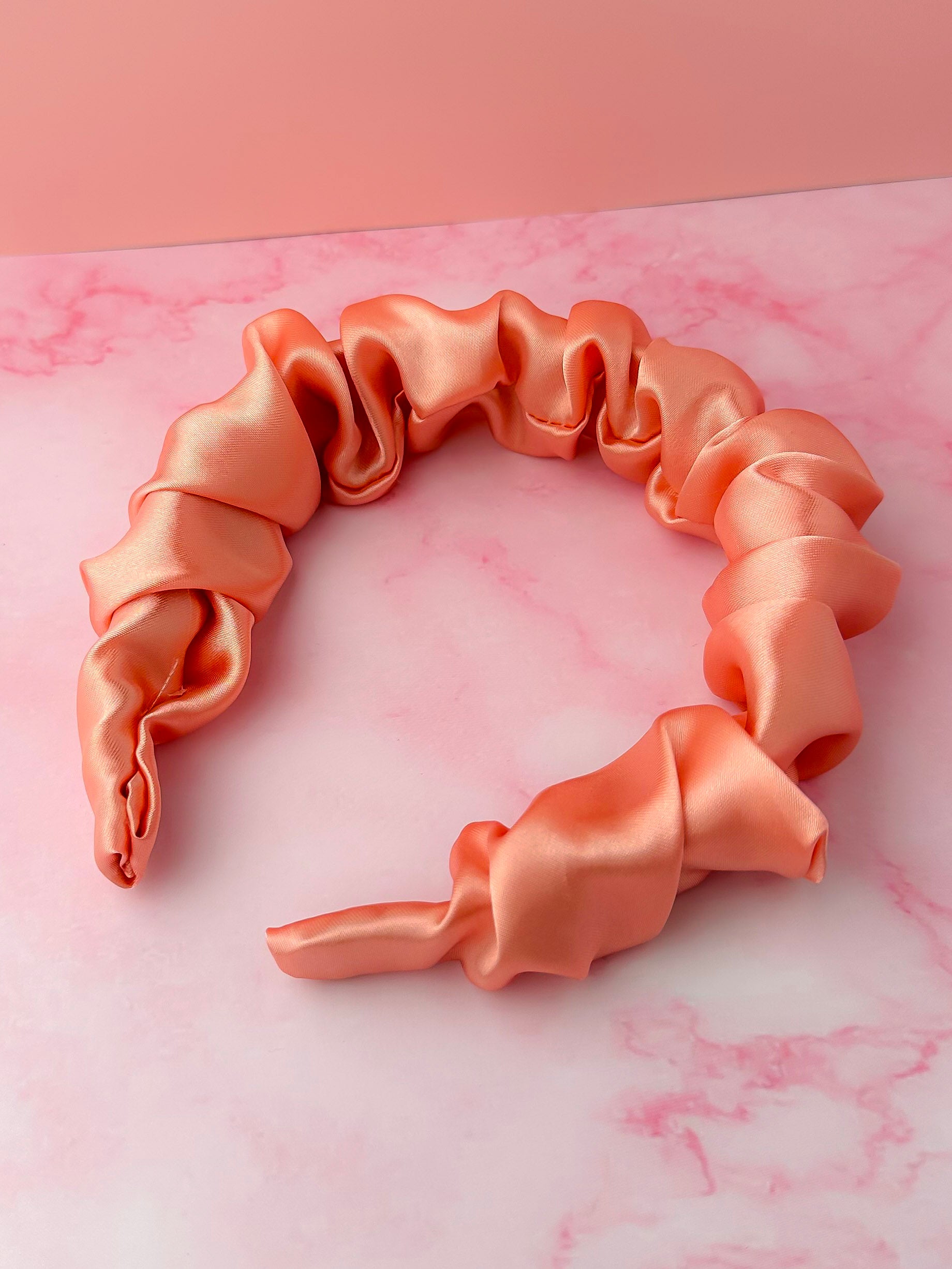 Slide on the Peach Satin Scrunchie headband and own the day.