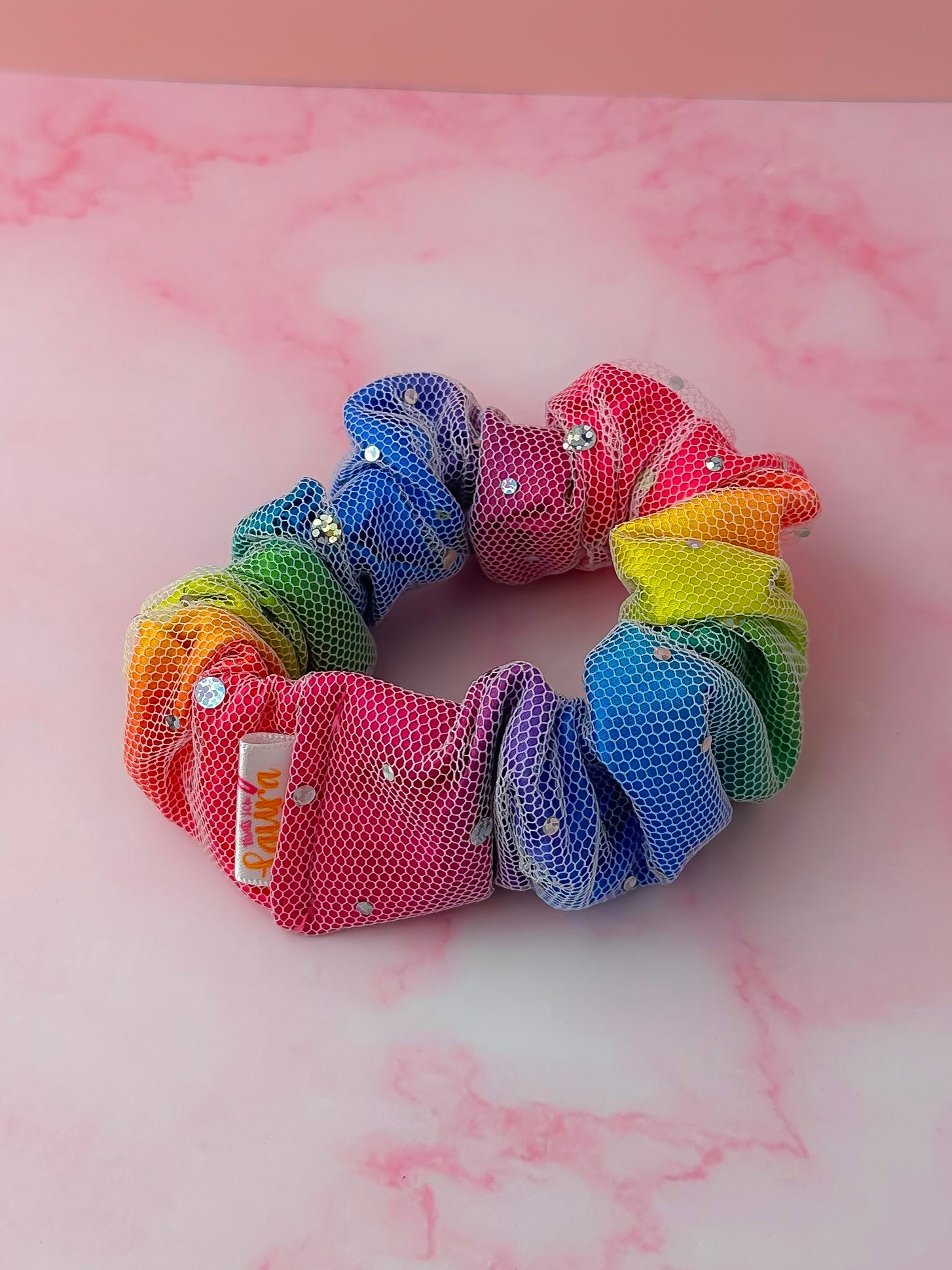 Rainbow Sparkle - Multicolour satin & mesh wide scrunchie